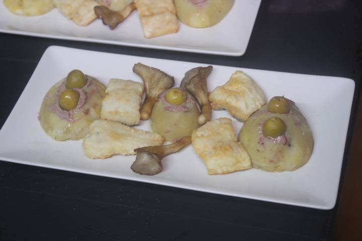 Llenamos con la ayuda de una cucharilla con paté los agujeros realizados en las patatas y decoramos cada agujero con una aceituna rellena.