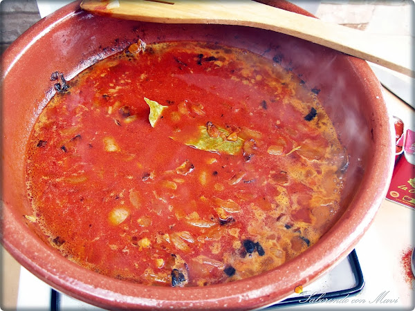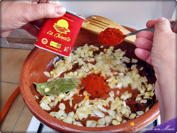 A continuación bajamos el fuego a mínimo y añadimos el pimentón dulce y el picante. Si no queréis picante le ponéis las 2 cucharaditas del dulce.