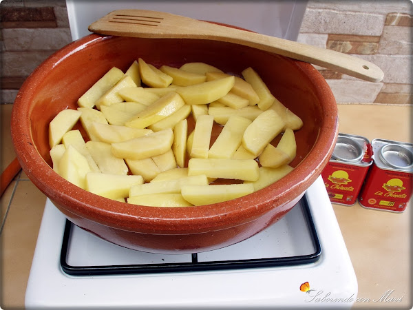 Calentamos el aceite y pasamos la tiras de patata un poco por la cazuela. Así se mojan en aceite y después las meto 5 minutos tapadas a máxima potencia al microondas para que se pongan tiernas. Reservar.