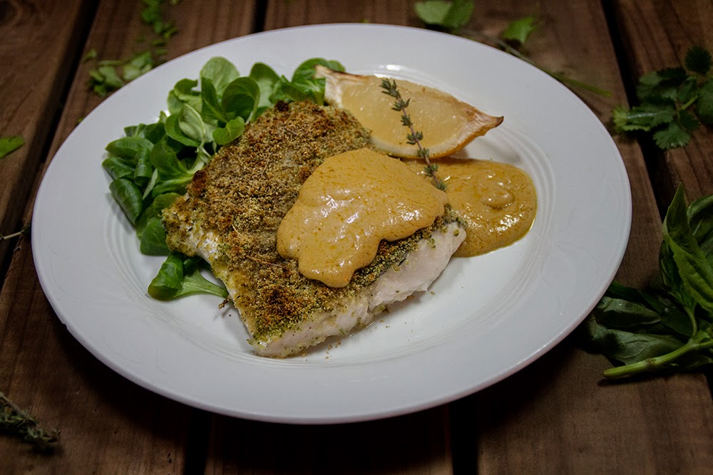 Hoy os dejo un riquiiiisimo lomo de merluza con una costra fresca de hierbas aromáticas y limón acompañada de una salsa que le da un toque original y sabrosísimo que hará la delicia de todos tus invitados y la tuya misma que es casi más importante.