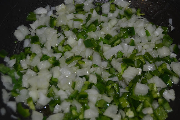 En una cazuela ponemos el aceite y pochamos la cebolla y los pimientos a trozos con un poco de sal.