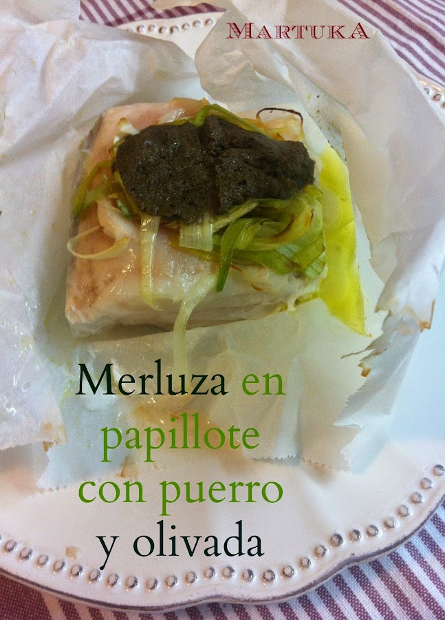 Se extienden 4 trozos de papel de horno (o papel de aluminio si no disponéis del otro) y se coloca en el centro el lomo de merluza salpimentado. Se cubre con un poco de puerro frito y con una cucharada de olivada. Se cierran los extremos como si fuera un paquetito.
