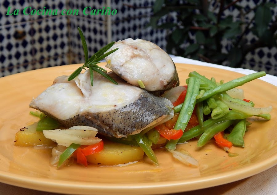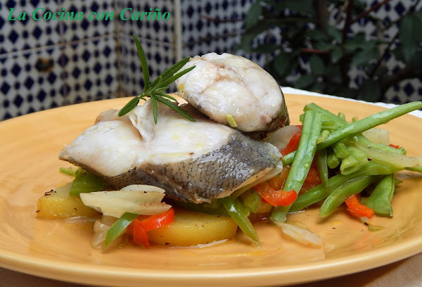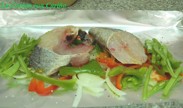 Metemos en el horno y dejamos en torno a 7 minutos. Abrimos con cuidado de no quemarnos con los vapores y colocamos en el plato de fondo las papas, encima las verduras y sobre ellas el pescado. Rociamos con el jugo por encima del pescado y listo para comer. Rico, de verdad.