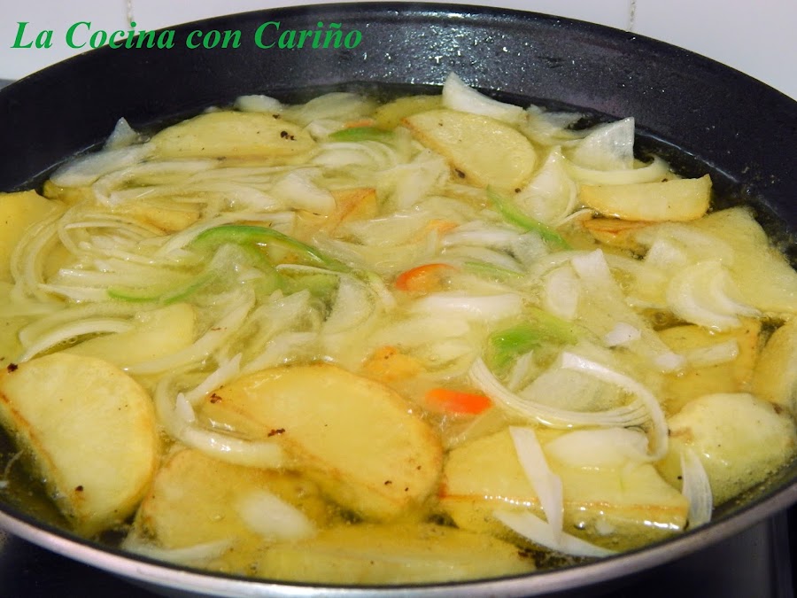 Empezamos preparando las papas a lo pobre tal y como viene en el enlace, pero añadiendo poca cebolla y pimiento, solo lo imprescindible para que tomen las papas sabor.