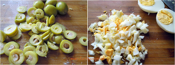 Pica en trocitos las aceitunas. el perejil y los huevos duros.
