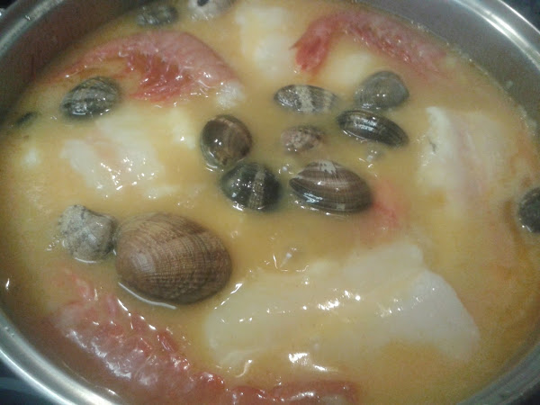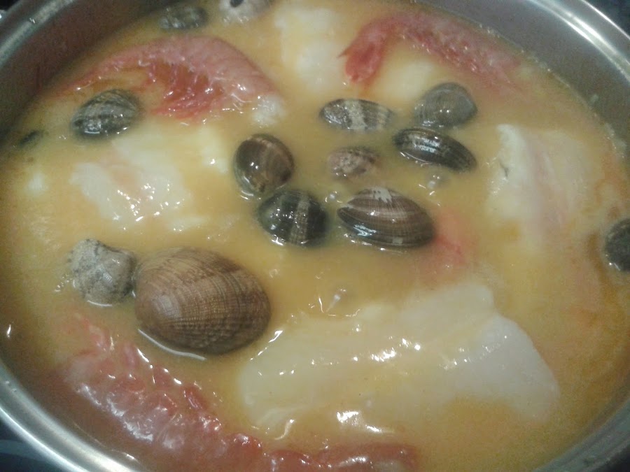 Cuando esté medio hecha la cebolla añadimos los ajos finamente picados (también los utilizo ya picados y congelados), si vais a utilizar guindillas las ponéis también, una vez esté todo pochado añadimos las dos cucharadas de harina, removemos bien, retiramos las guindillas y le incorporamos el medio vaso de vino blanco, dejamos un par de minutos y le incorporamos el caldo o agua, el pimentón dulce y las cabezas de los gambones.. Añadimos los trozos de merluza.. Si no habéis utilizado caldo le ponéis media pastilla de caldo concentrado.. Ponemos las colas de los gambones y tapamos cocinando a fuego suave.. de vez en cuando meneamos la olla.. Tardará muy poco tiempo, cuando veamos que la merluza está medio hecha le incorporamos las almejas.. tapamos y dejamos que se haga a fuego suave.. en cuanto veáis que la merluza está hecha y las almejas abiertas retiradla del fuego para que no se pase.. rectificáis de sal y listo..