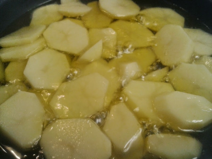 Nosotros acompañamos la merluza de unas patatas que cortamos en rodajas gruesas y freimos a fuego suave..