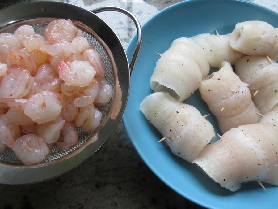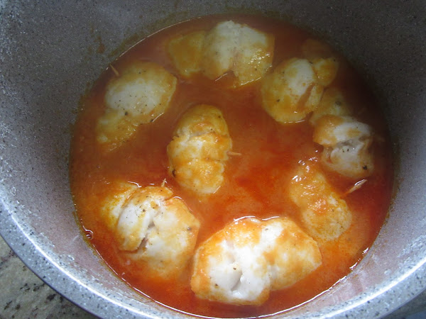 5- Despresurizar, agregar el caldo de pescado, la maicena y perejil, triturar la salsa. Devolver a la cubeta, repartir unas 50 gr. de gambas enteras, colocar la rejilla en el fondo y el pescado encima y cocer, válvula cerrada, 3 minutos, Vapor, 120º, media presión.