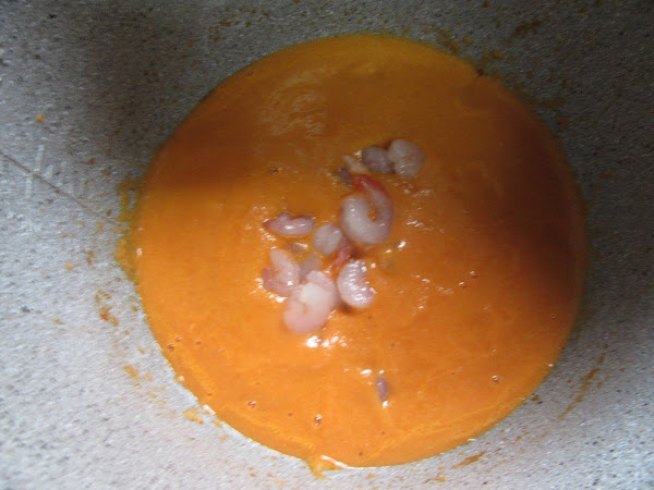 4- Añadir las gambas, el tomate, pimienta y pimentón, mezclar bien. Válvula cerrada, menú turbo, 5 minutos, 140º, presión alta.