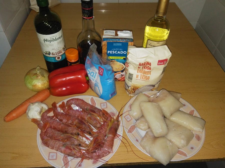 Pelamos los gambonesy reservamos las cáscaras y las cabezas. En una sartén o cacerola con un poco de aceite sofreímos las cáscaras de los gambones y sin sacarlas añadimos las verduras picaditas.
