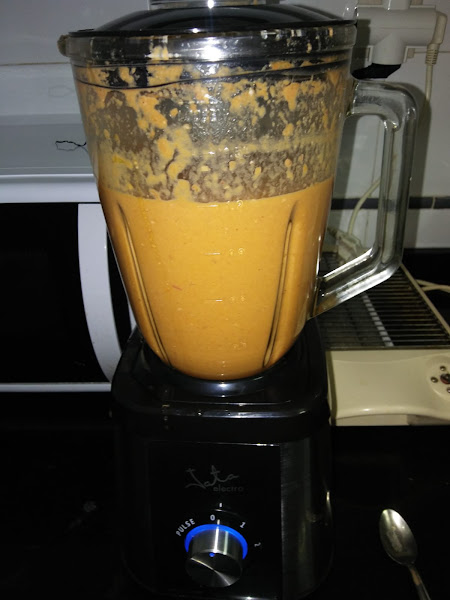 Una vez que las verduras están cocinadas, añadimos el brandy y flambeamos, agregamos el vino blanco y el caldo. Dejamos cocer diez minutos y trituramos y pasamos por un chino para que la salsa quede muy fina, si queremos que tenga más color la salsa, añadimos un poco de colorante amarillo.