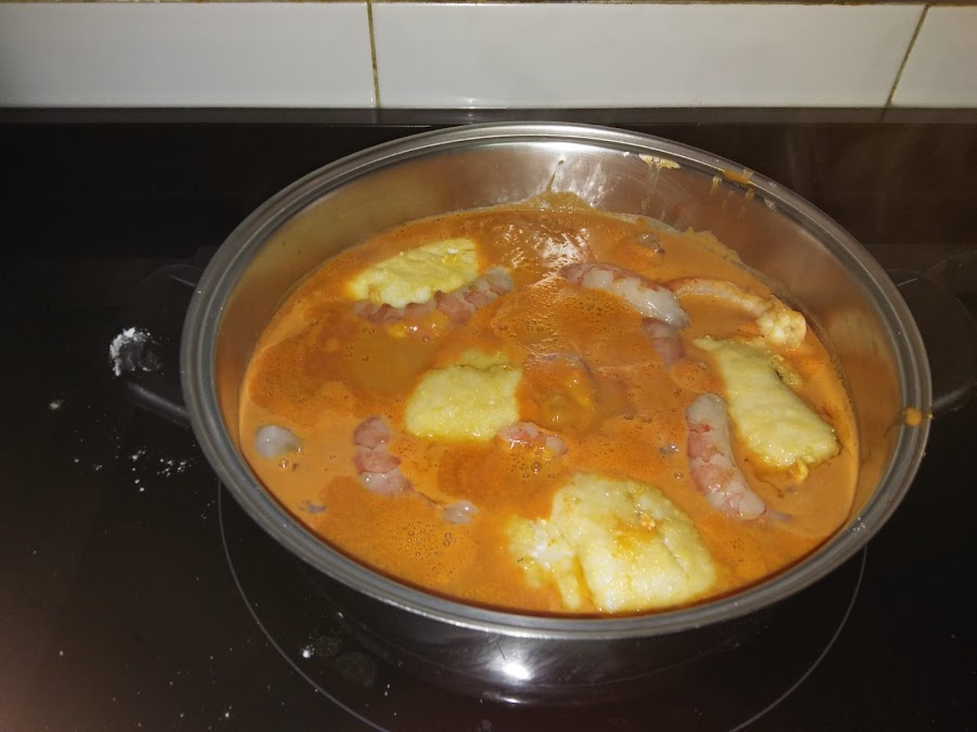 Salamos y secamos los filetes de merluza, los pasamos por harina y marcamos y le agregamos la salsa que teníamos cocinada y añadimos los gambones pelados. Dejamos cocer a fuego suave durante cinco minutos y ya está listo para servir.