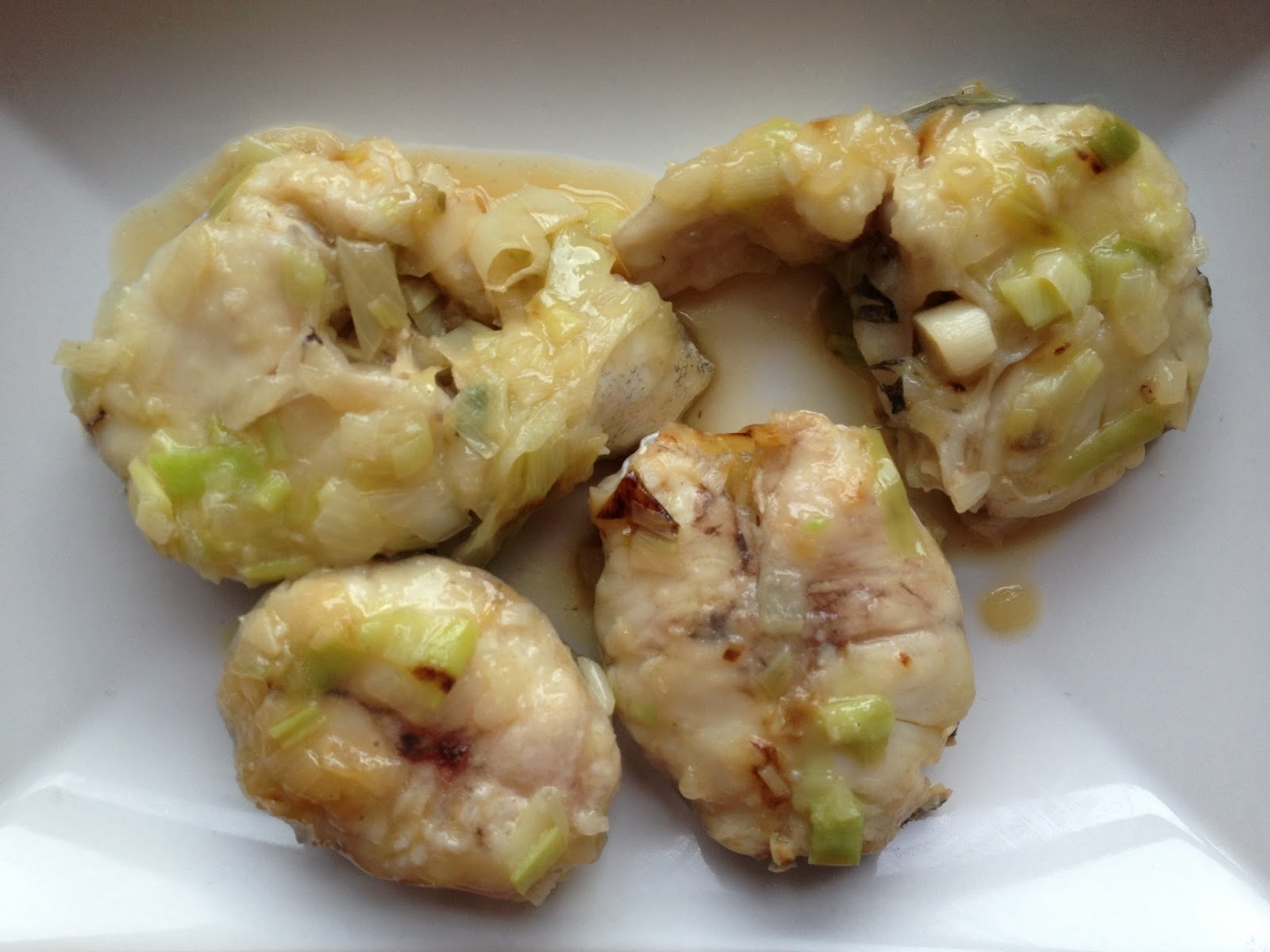 5 Los puerros posiblemente ya estén blanditos , probamos el punto de sal y añadimos las merluzas a la cazuela.