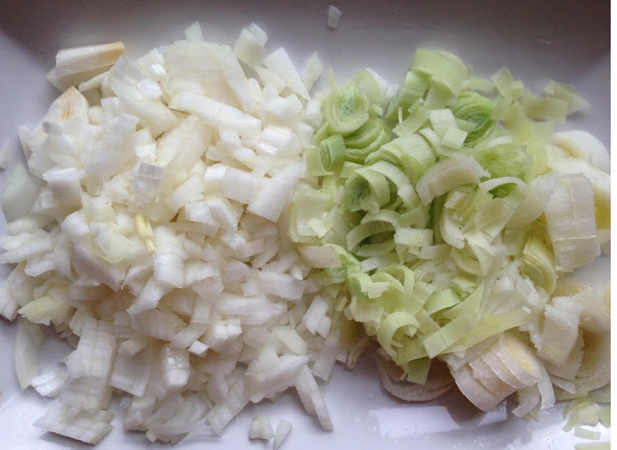 1 Ponemos a calentar la cazuela con aceite de oliva, la cantidad de aceite es cubrir el culo de la cazuela . Mientras se calienta el aceite, cortamos en brunoise o cachitos pequeños la cebolleta y puerros .
