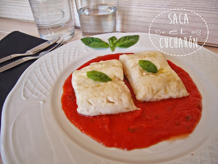 Servimos colocando salsa de tomate a la albahaca en la base del plato y los lomos encima junto con unas hojas de albahaca fresca.