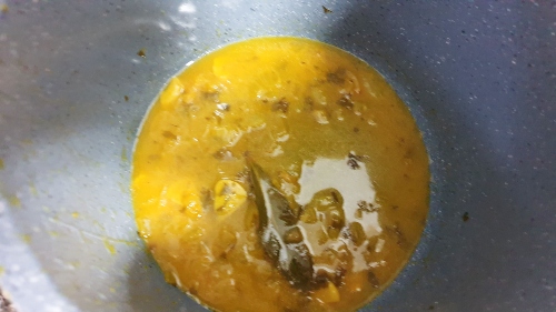 4- Añadir a la cubeta la harina, remover un poco para que se tueste, agregar el majado de ajo y perejil, el vino blanco, agua, laurel, 1/2 pastilla de caldo carne, y pizca de colorante, dar un hervor.