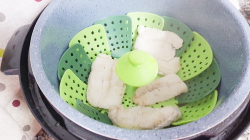 4- Si la hacéis al vapor, como la he hecho yo, colocar la rejilla, el pescado encima adobado y válvula cerrada, menú presión vapor, 5 minutos, 130º, media presión.