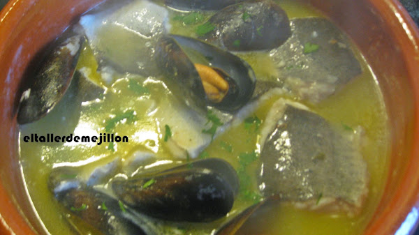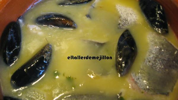 Cuando la salsa esté bien ligada colocamos las porciones de merluza y los mejillones, que hemos lavado y limpiado muy bien.