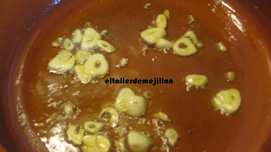Limpiamos los ajos y los cortamos en rodajas. En una cazuela u olla vertemos el aceite de oliva y añadimos los ajos hasta que se doren, con cuidado de que no se nos pasen.
