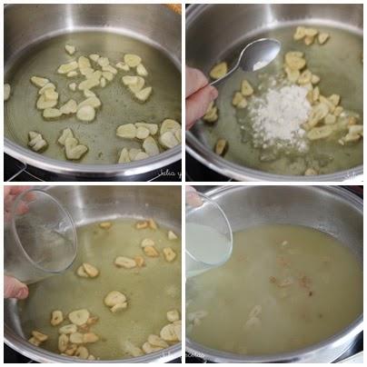 Pelamos y cortamos los ajos a rodajas. En una cazuela ponemos un poquito de aceite y sofreímos los ajos, cuando estén dorados añadimos la harina y removemos bien. Añadimos el vino blanco y cuando hierva un poquito y pierda el alcohol añadimos el caldo de pescado