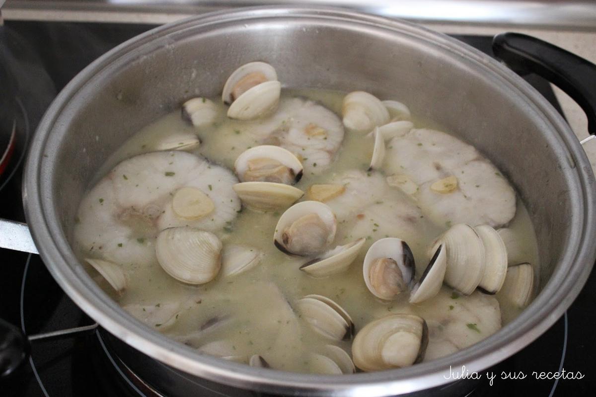 Dejamos que se haga la merluza durante 3 minutos por cada lado y añadimos las almejas.