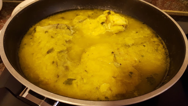 6.- Echamos el vino blanco y volvemos a colocar las rodajas de merluza rebozadas.