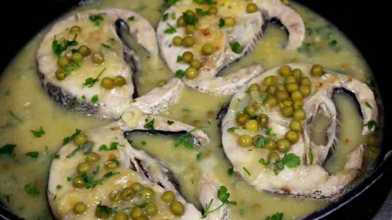 Agregamos el vino blanco y el caldo de pescado y dejamos a fuego medio alto que se vaya haciendo la merluza