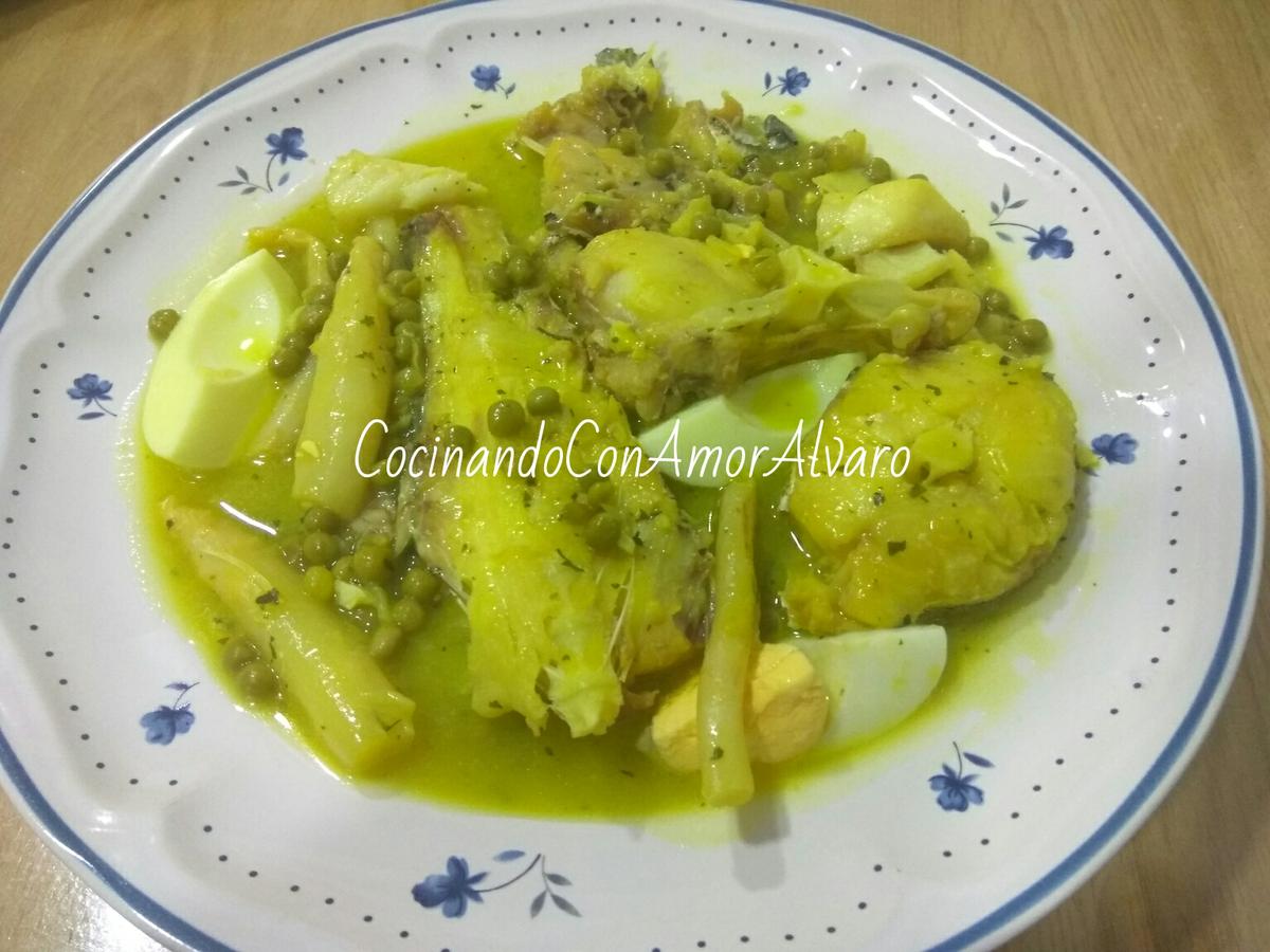 Luego agregaremos un fumet de pescado, dejaremos cocer e incorporaremos la merluza para que cueza. Lo acompañaremos con unos guisantes, espárragos y huevo cocido. Y el plato nos quedará espectacular.