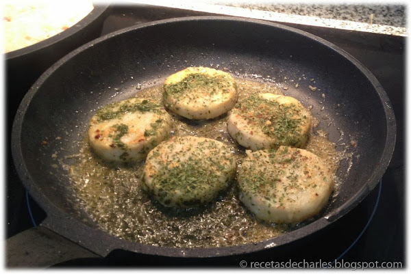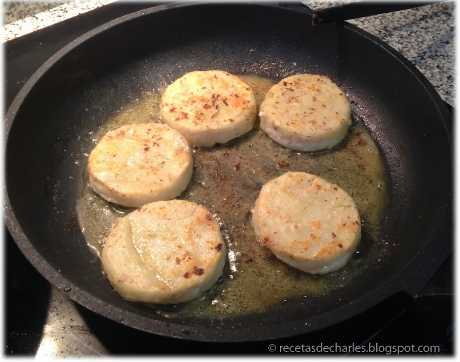 En una sartén echamos un chorro de aceite y vamos friendo las rodajas por los dos lados. No hace falta que los trozos de merluza queden bien hechos por dentro, con que queden dorados por fuera es más que suficiente ya que luego se van a terminar de hacer al cocer la salsa. Usad una sartén grande porque utilizaremos este mismo recipiente para rematar el plato.