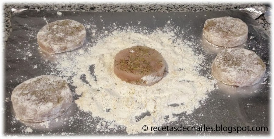 En este caso yo he utilizado rodajas de merluza congeladas. Son una buena alternativa cuando no podemos disponer de una merluza fresca. Empezamos echando una pizca de sal, pimienta y romero a la merluza y la pasamos por harina por ambos lados. Procurad que quede bien enharinado, porque luego la harina sobrante nos va a servir para ligar la salsa.