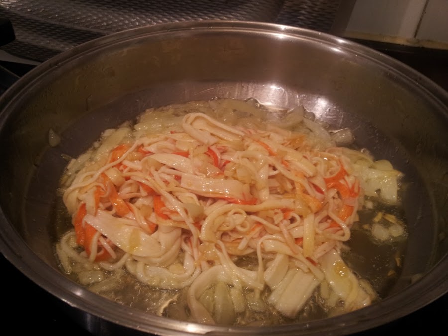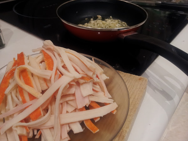 Cuando el ajo esta doradito se añaden los Tronquitos de Mar, se rehogan con el ajo hasta que empiezan a dorarse un poco.
