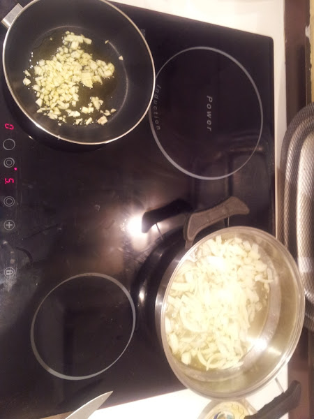 Freimos en sartenes separadas el ajo y la cebolla. el ajo se hace despacio y la cebolla pochadita.