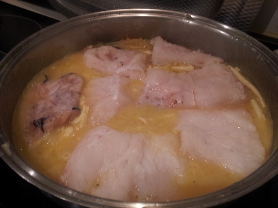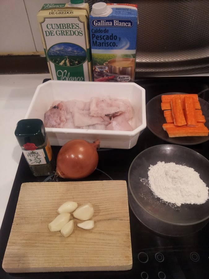 Cuando la cebolla está pochada se le añade los tronquitos al ajillo, se le dan un par de vueltas todo junto y se le añade una cucharada sopera de harina, se remueve otro par de vueltas para que la harina se fria y se añade el caldo de pescado y/o vino. Rápidamente se añaden los trozos de merluza, en caso de tener piel, con la piel hacia abajo. y ponemos a fuego medio-bajo.