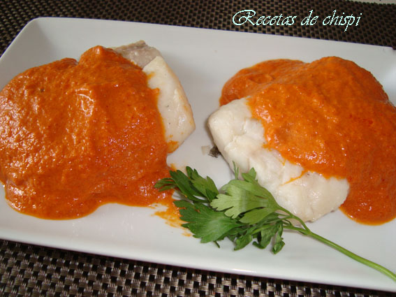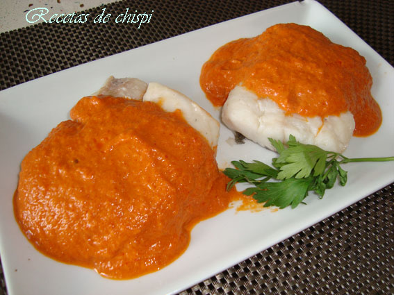 Cortamos la cebolla en dados y añadimos al aceite, dejamos que se fria sin que llegue a dorarse, la pasamos al vaso de la batidora junto con el aceitey añadimos la carne del pimiento y triturar, rectificamos de sal, volcar de nuevo en la sarten y colocar el pescado dentro, dejar cocer dos minutos para que coja el sabor y servir. Si la salsa está muy espesa aligerarla con un poco de agua.