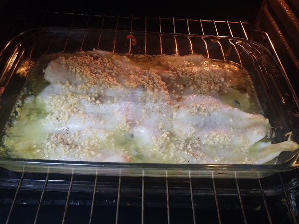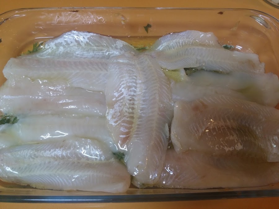 Cinco minutos antes de que acabe la cocción del pescado, agregamos esta mezcla por encima. Y listo.