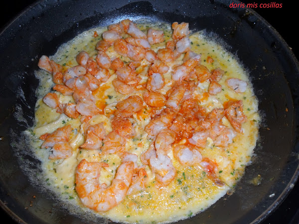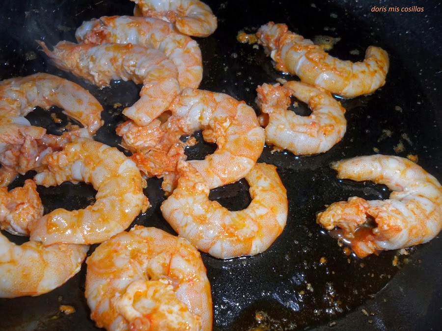 En una sartén pequeña, con unas gotas de aceite de oliva, pelamos y salteamos las gambas unos minutos, solo hasta que cambian de color.