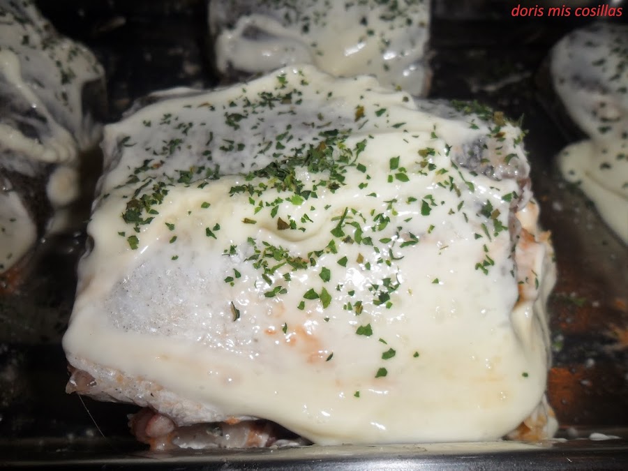 Una vez rellena, cubrimos con mayonesa abundantemente y espolvoreamos con perejil.