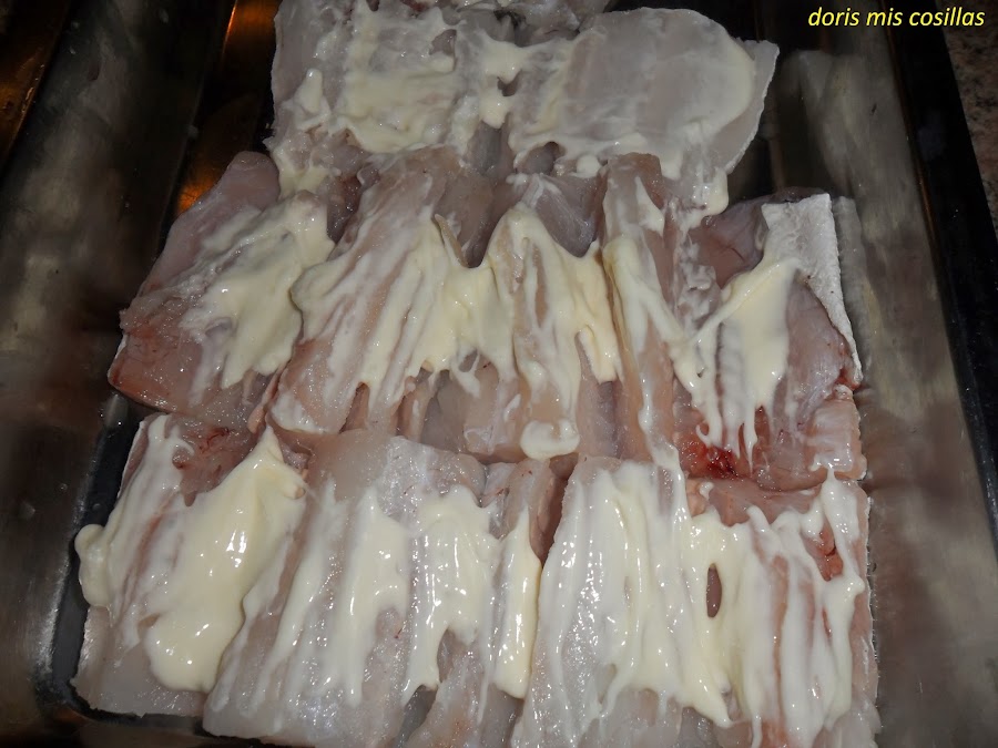 Pincelamos generosamente la merluza reservada con mayonesa.