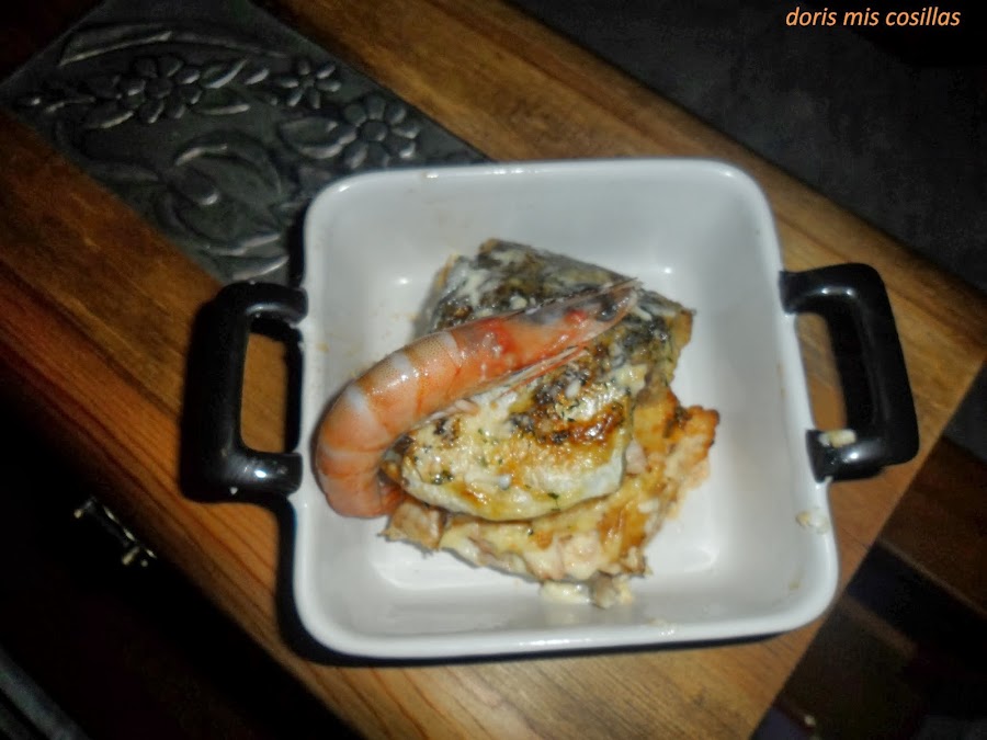 Rellenamos con la tortilla de gambas, cada trozo de merluza repartiendo el relleno en cada pieza.