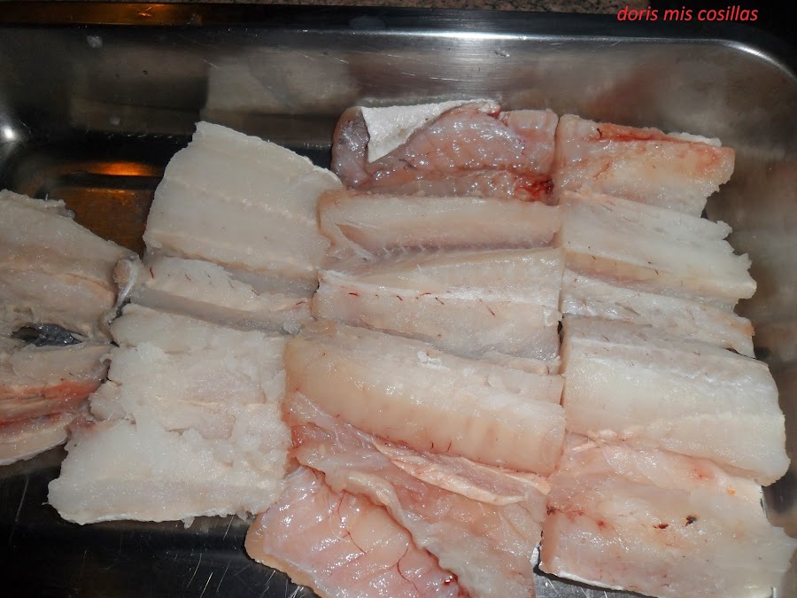 Retirar de la merluza la espina central, escamar y quitar todas las espinas y telillas y colocamos sobre la bandeja del horno abierta como un libro a trozos regulares.