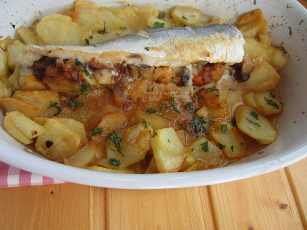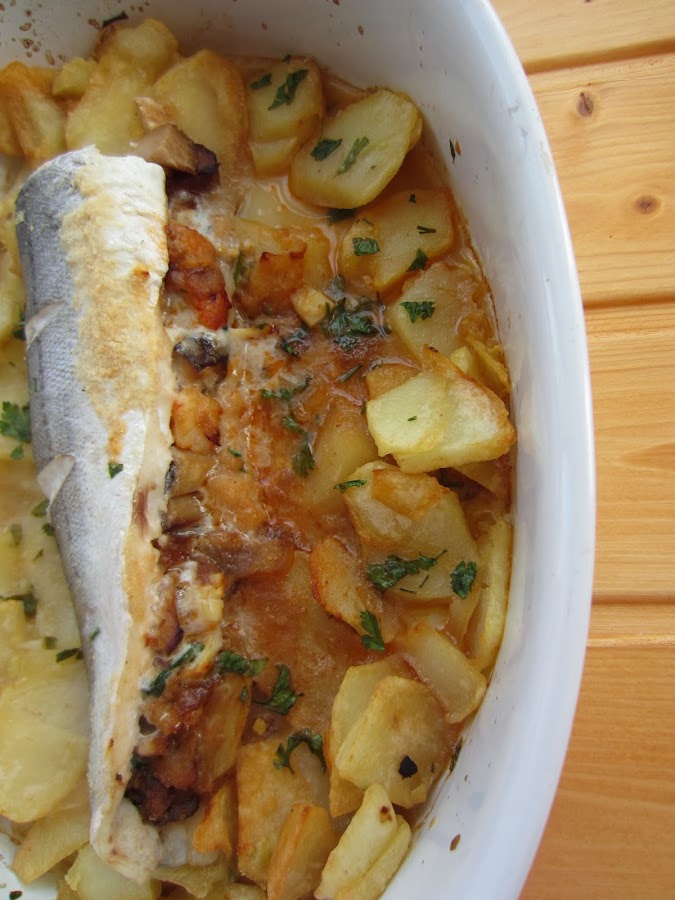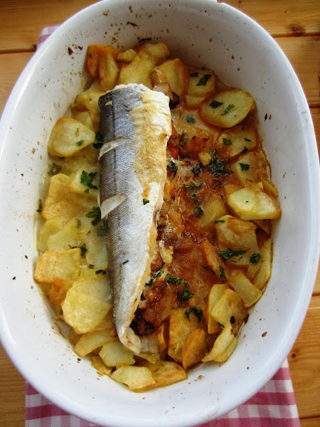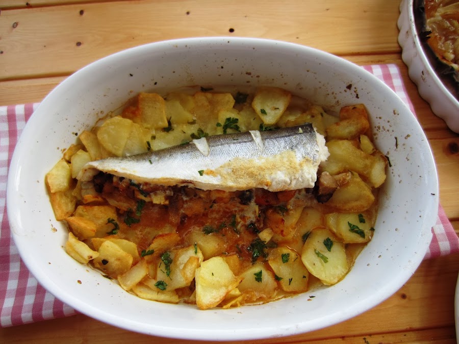 A los 10 minutos ponemos las patatas panadera a los dos lados de la merluza.