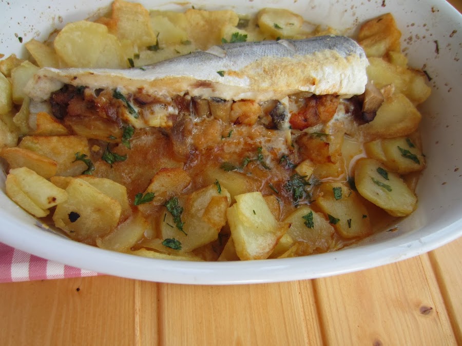 MERLUZA RELLENA DE GAMBAS Y SETAS SOBRE CAMA DE PATATAS PANADERA