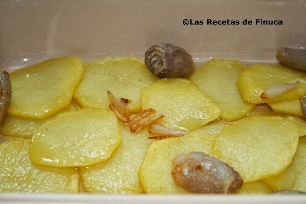 Mientras hacemos lo anterior, en una sartén ponemos a calentar el aceite. Pelamos y cortamos las patatas no muy finas y pelamos las cebollitas. Salamos. Lo freímos todo a fuego medio. En una vitrocerámica del 1 al 9 en el 7. Que nos queden medio hechas porque luego irán al horno. Las colocamos en una fuente de horno.