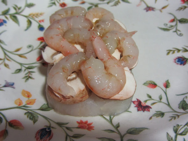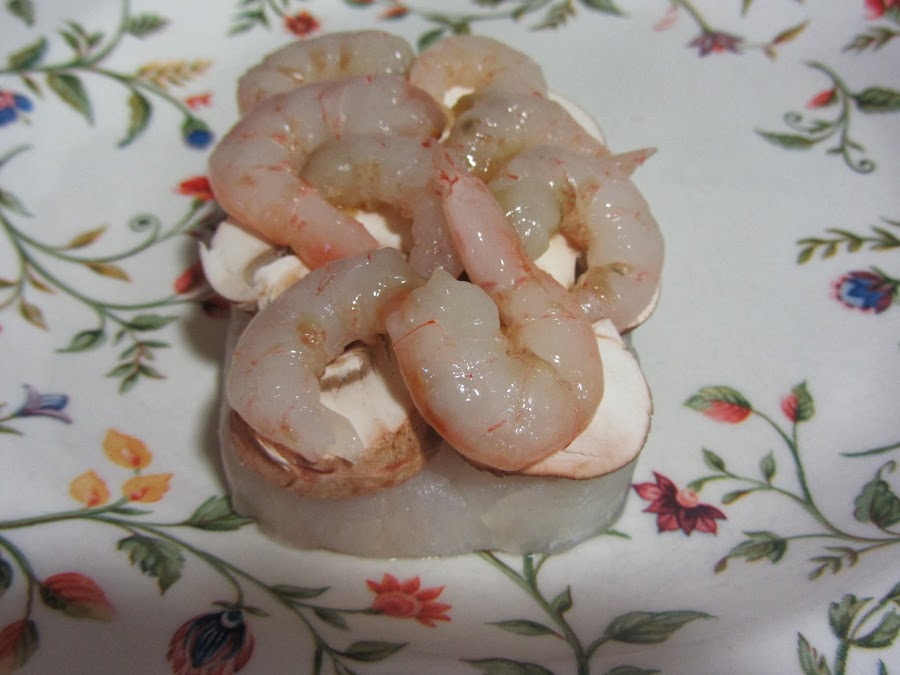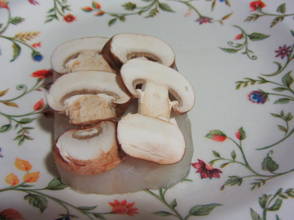 Limpiamos y laminamos los champiñones. Salpimentamos los lomos de merluza, y vamos colocando los champiñones sobre uno de los lomos.