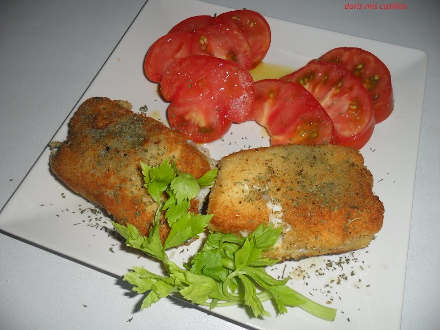 Pasamos cada trozo por harina sellandola bien por todas partes, luego huevo batido y pan rallado.Calentamos en una sartén aceite abundante y vamos friendo de uno en uno los trozos.