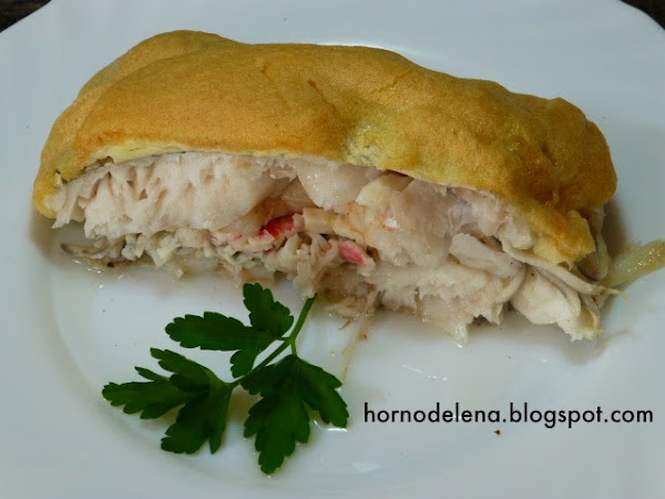 Ponemos las angulas sucedáneas sobre el lomo, encima ponemos la chaca (surimi) y por último los langostinos. Cubrimos con el otro lomo de merluza con la piel hacia arriba.