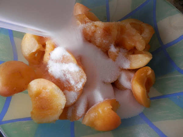 En un bol, ponemos los albaricoques y echamos encima el azúcar y el zumo del medio limón.
