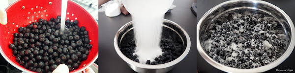 Lavar y escurrir los arándanos. Ponerlos en un bol y añadir el azúcar, mezclar bien y dejar macerar durante una hora como mínimo. En este caso estuvo toda la noche en la nevera.