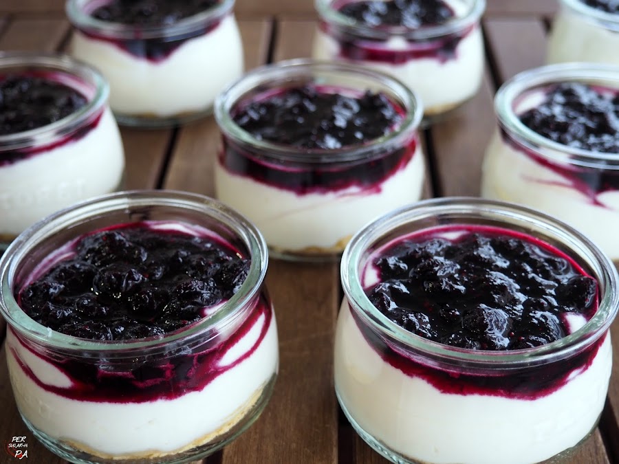 Sugerencia de presentación: Vasitos de mousse de queso fresco y mermelada de arándanos.