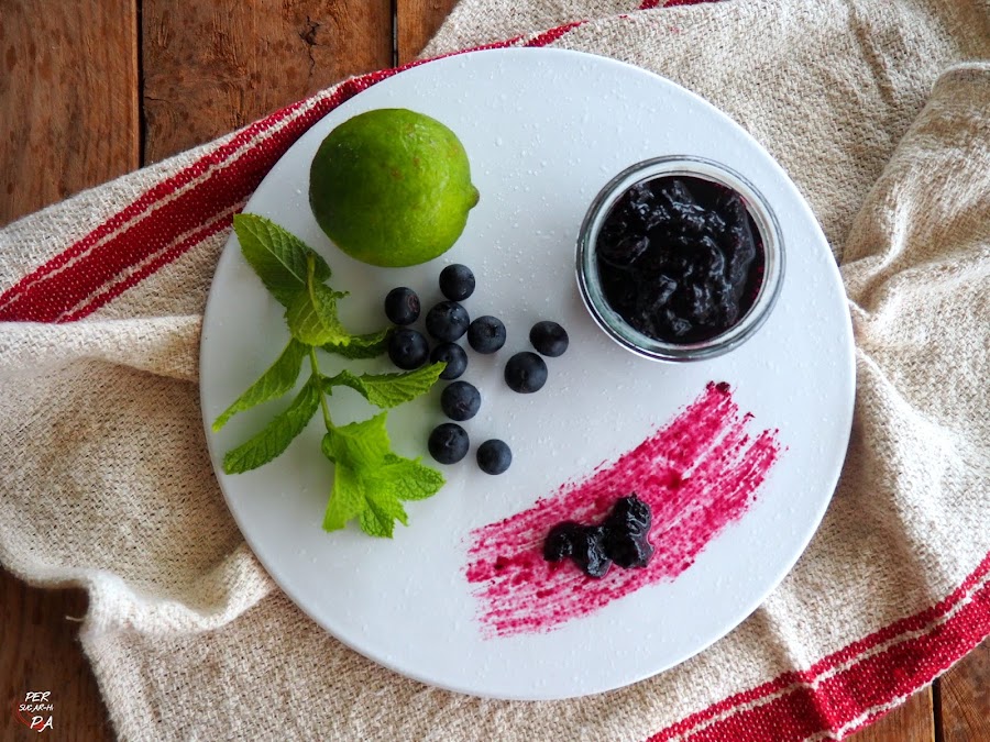 Para nuestros botes de finales de verano hemos elegido arándanos, que hemos perfumado con lima, menta y ron, vamos lo que viene siendo un MOJITO, y el resultado una fresca, aromática y divertida mermelada.